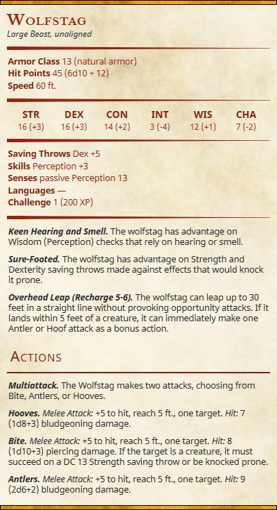 If you want to separate out the dimorphic female wolfstag in your D&D game, just remove the antler attacks.