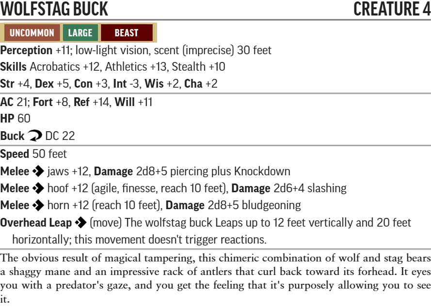 The stats for Pathfinder 2e and D&D 5e leave us with some pretty straightforward monsters that don’t require a lot of strategy to work into a battle at the table. They won’t serve well as a solo encounter, but when combined with a skill challenge (like a chase scene in the woods for a party trying to capture one alive) or a main villain (where they’ll serve as an excellent druid- or wizard-themed mount), they add a nice touch of flavor and mechanics that doesn’t steal the show or require a lot of brainpower to manage.